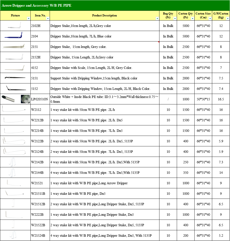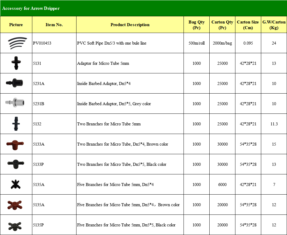 2. Arrow Dripper dihubungkan dengan pipa PVC lunak Dn5/3mm dan adaptor, juga dapat dihubungkan dengan rakitan Multi-outlet untuk mendapatkan beberapa ou