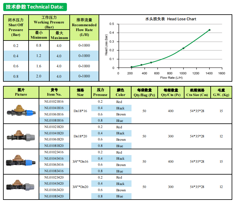 ·Tersedia beberapa tekanan yang telah ditetapkan, cocok untuk sistem irigasi dengan kondisi kerja dan medan yang berbeda.